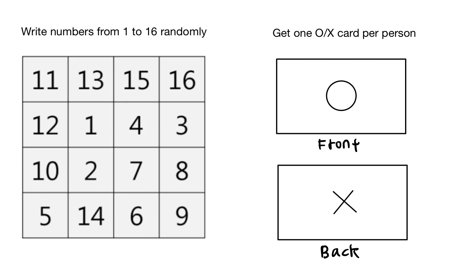 빙고 기록지 1장(아무 것도 안 적혀 있는 카드)과 O,X 카드를 1장씩 나눠가집니다.